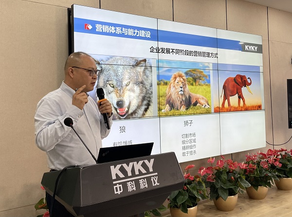 余才林分别从何为营销体系、营销体系与能力建设、重点行业分享三个方面做了精彩分享。他从何为营销体系进行引入,阐述了营销体系构建的五项重要工作。通过讲解企业发展不同阶段营销管理方式,引出科仪营销体系与能力建设的现状分析,提出与销售七大要素相结合的四大管理板块,运用大量的案例与实战,深入浅出的阐述了如何通过优化组织、明确方向、规整打法、精细管理来构建高质量发展的集团化营销体系。最后,他对重点行业应用、产业链、未来发展及行业解决方案进行了分享。
