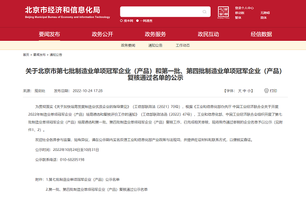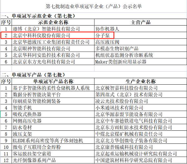 2022年10月24日,北京市经信局公示第七批国家级制造业单项冠军企业(产品)名单,该名单由工业和信息化部、中国工业经济联合会审核通过,北京中科科仪股份公司再获制造业单项冠军示范企业殊荣。
