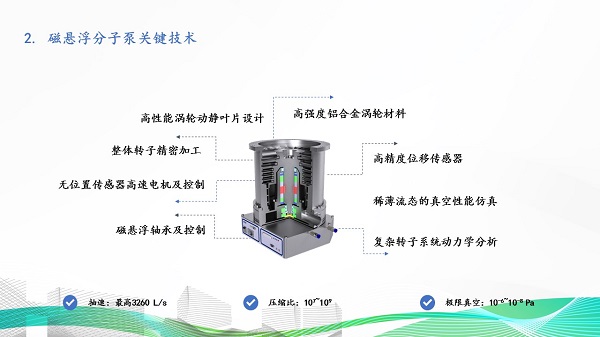 磁悬浮分子泵可获得清洁无油的超高真空环境,是集成电路前道工艺刻蚀、离子注入、薄膜沉积装备的关键核心零部件。中科科仪磁悬浮分子泵突破磁悬浮轴承及控制、无位置传感器高速电机及控制、整体转子精密加工、高性能涡轮动静叶片设计、高强度铝合金涡轮材料、精度位移传感器、稀薄流态的真空性能仿真、复杂转子系统动力学分析等关键技术,满足集成电路制造工艺的严苛要求,性能指标对标国际一流产品,供应链实现完全自主可控。